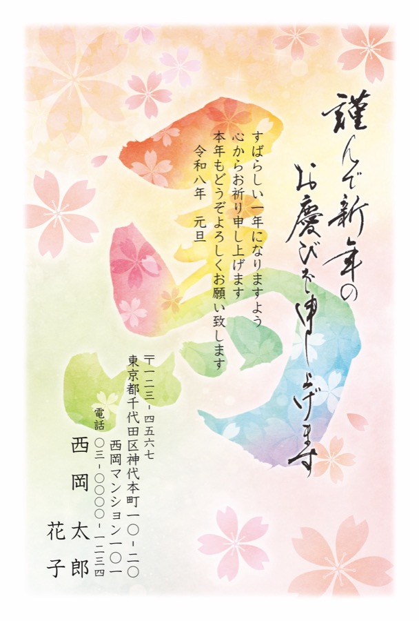 桜模様と鮮やかな色合いが印象的な華やかな年賀状です。
